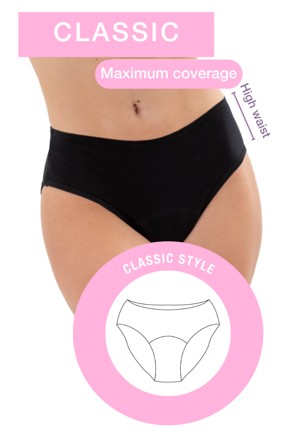 Sustainable menstrual underwear Discover the freedom of movement and peace of mind during your period with our sustainable menstrual underwear. Explore our collection and choose the model that best suits your lifestyle and needs. Join us on the journey towards a healthier and more sustainable period, without compromising on style or the planet. Our Classic model is perfect if you prefer full coverage and maximum security. With a high-rise design at both the front and back, these panties provide a sense of comfort and protection throughout the day. 100 Washes , No leakage , Organic Cotton.