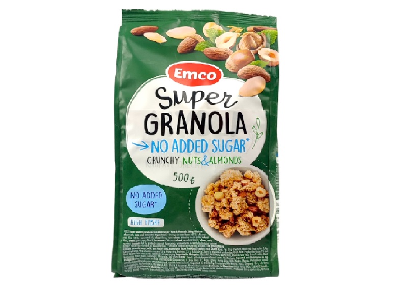 Super granola No Added Sugar with nuts and almonds is a new crunchy granola without added sugar and without artificial sweeteners. Sweet taste of granola is thanks fiber extracted from the root of chicory. Delicious combination of nuts makes a great taste. Moreover, Granola is a natural source of beta glucans that helps to lower cholesterol and is rich in fiber from oat flakes. Super granola is with no palm oil and no added colors.